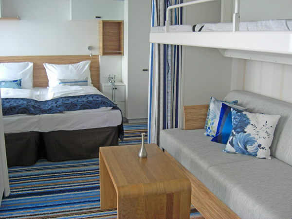 Das Wohlfühlkonzept zieht sich konsequent durch alle Bereiche. Die Kabinen sind hell, modern und umweltfreundlich. 82% der Kabinen sind Balkonkabinen. Auf Gäste mit besonderen Bedürfnissen, wie Familien oder Großfamilien, aber auch Behinderte wurde eingegangen und spezielle Kabinen hierfür entworfen. Für den anspruchsvollen Kunden gibt es Spa Kabinen, Juniorsuiten und die Himmel und Meer Suiten, die keine Wünsche offen lassen.