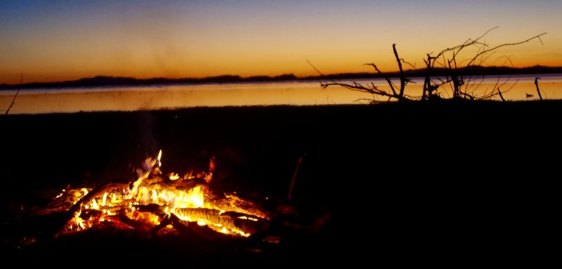 Schnelles Frischmachen, in die Klamotten springen. Ich stelle mich mit einem Pot Kaffee in der Hand ans Feuer und beobachte die aufgehende Sonne.